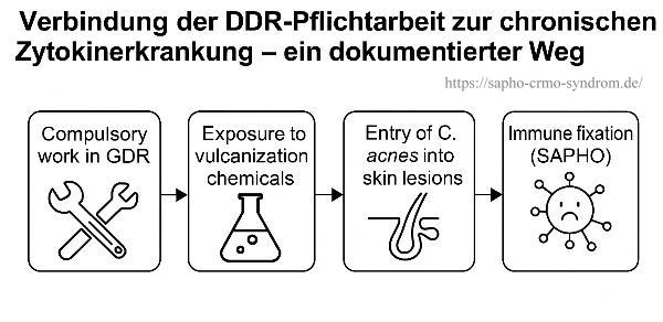 Die damalige Exposition gegenüber Vulkanisationschemikalien in der Reifenproduktion ist plausibel als Startsignal („Hit 1“) einer immunologischen Sensibilisierung mit chronischer Hautentzündung (Pustulose). Über wiederholte Entzündung, Mastzell‑Aktivierung und Zytokinfreisetzung ist ein Übergang zur autoinflammatorischen Knochenbeteiligung (SAPHO/CRMO) konsistent erklärbar.