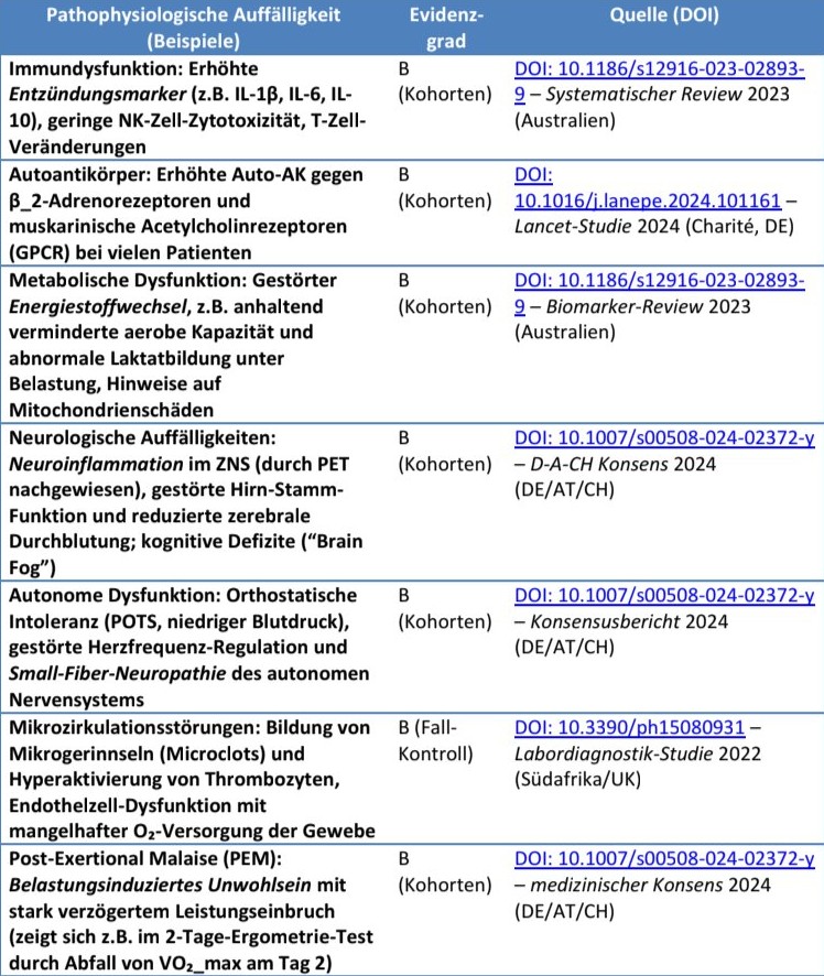 Die Tabelle zeigt zentrale organische Befunde bei ME/CFS, deren Wiederholung und Reproduzierbarkeit in Studien für eine körperliche Genese sprechen. Jeder Befund wird durch peer-reviewte Literatur gestützt und mit Evidenzgrad sowie DOI-Quelle ausgewiesen.